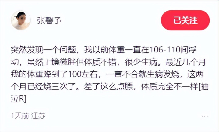 在近日,张馨予又发文:觉得有一个问题,之前自己微胖的时候体质很不错,很少生病,没想到瘦10斤后体质变差,一言不合就生病发烧,两个月的时间就发烧了三次,而且在2月1日,张馨予又在社交平台发文:等她满血复活。
