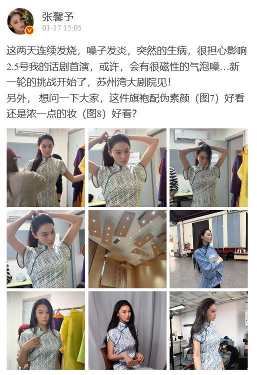而张馨予心态也好了很多,去参加了一次话剧排练,从排练再到正式演出也要两个月的时间,临近演出,没想到张馨予频频出状况,在1月中下旬的时候就说到自己生病,担心自己的话剧首演,而且还是连续两天的发烧嗓子还发炎。